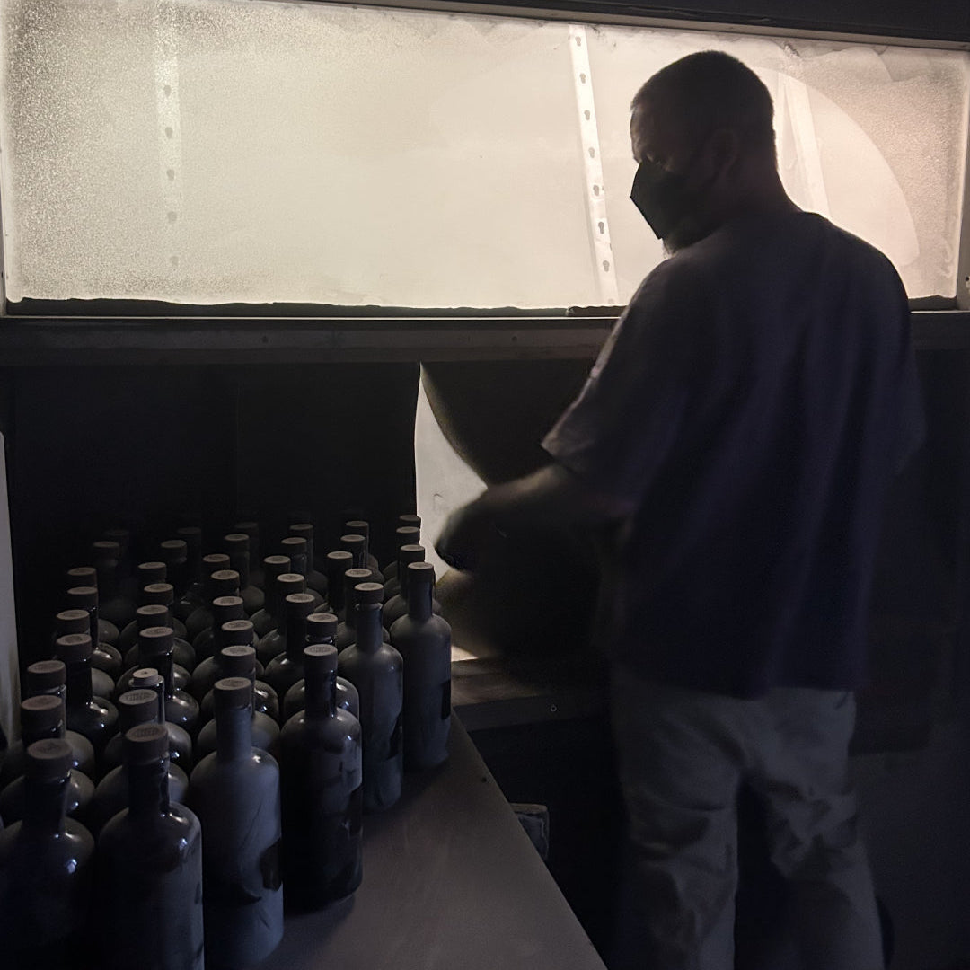 Jede Flasche ist ein signiertes und nummeriertes Unikat, ein trinkbares Kunstwerk mit Zweigen des legendären Wildkirschbaums, übertragen per Sandstrahltechnik und handübermalt mit Siebdruckfarbe.