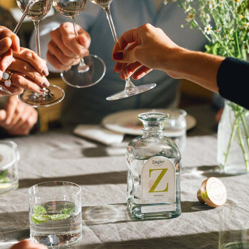 Die gute, alte Williamsbirne segelt bei uns hart am Wind. Und zwar nicht auf ihrem recht kurzen Weg zu uns in die Brennerei, sondern bei ihrem Einsatz. Denn sie bildet ganz nach dem Motto „living on the edge“ erst ganz am Ende der Destillation ihr ganz typisches, heißgeliebtes Aroma. Damit dieser Vorgang perfekt ist, haben wir das Prozedere jahrzehntelang verfeinert und ausgelotet.